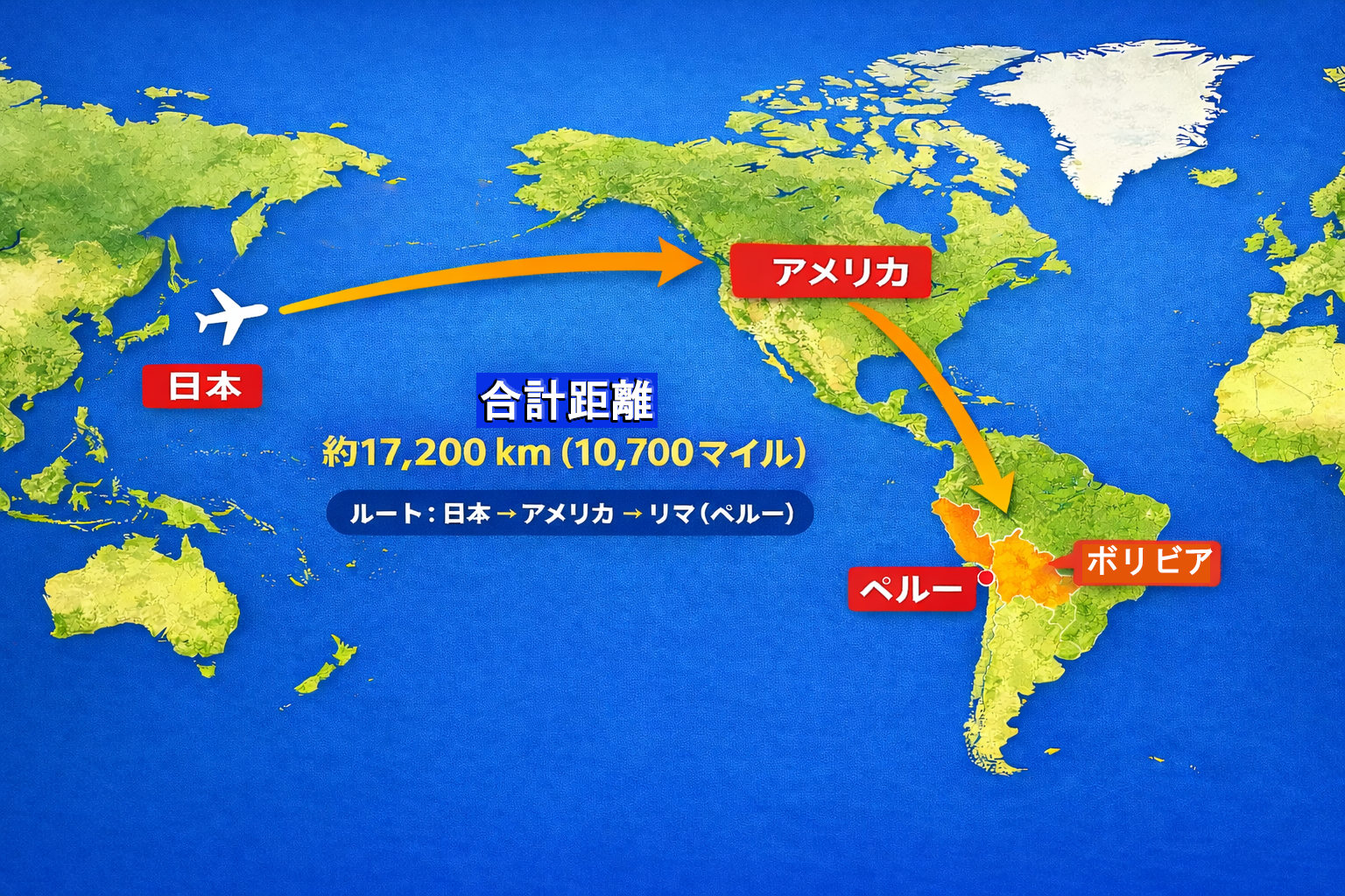 日本からアルパカの故郷へ向かうには、まず太平洋を越え、飛行機を乗り継いで南米へ向かいます。