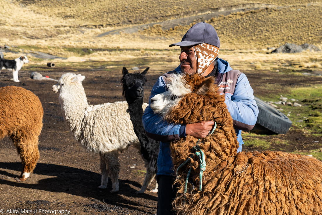 ボリビアから続く高原地帯は標高約4500mに達します。ペルー側では、輸出を意識した品種改良が積極的に進められ、白い毛のアルパカが多く見られます。