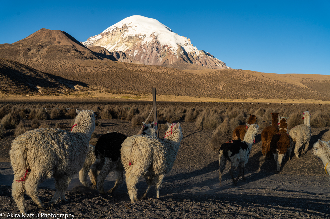 ボリビア最高峰サハマの裾野に広がる草原地帯です。地平線まで続く風景は一見すると荒涼として見えますが、山がもたらす水資源によって、古くからアルパカの重要な産地となってきました。