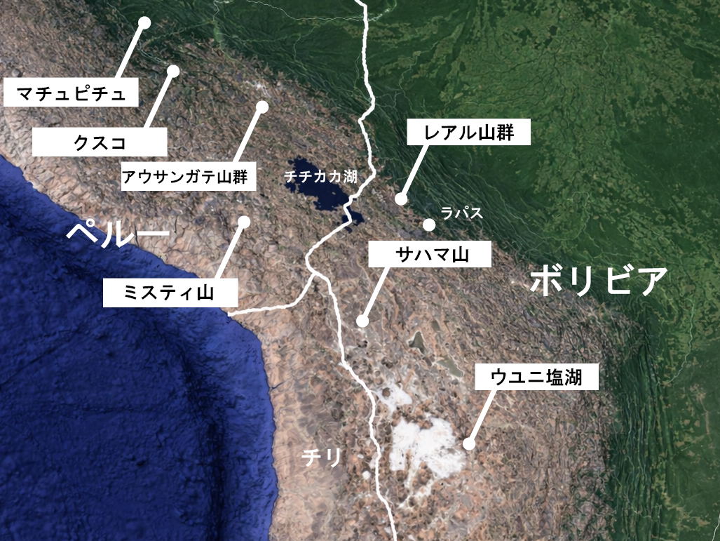 国でいえば、ペルー、ボリビア、チリ、アルゼンチン、エクアドルにまたがっています。