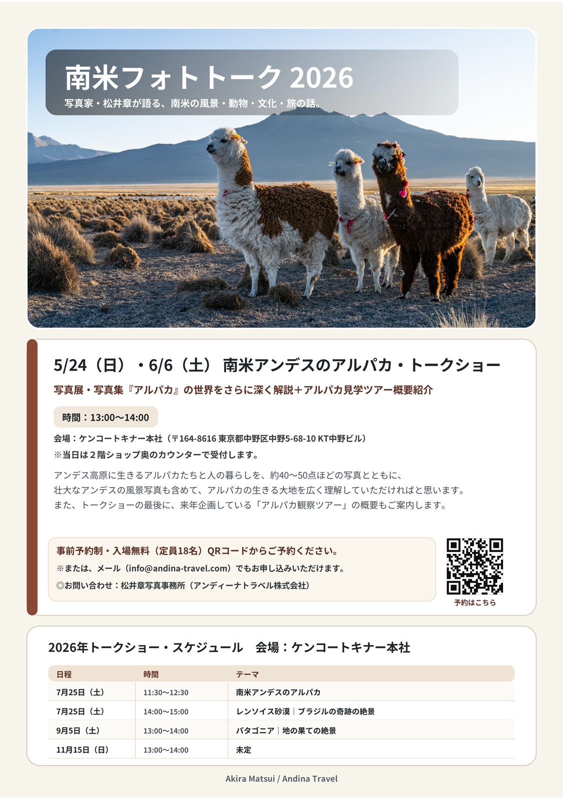 また、スライドショーの最後には15分ほどいただき、現地ペルー・ボリビアでの来年開催を目指す「アルパカ観察ツアー」も紹介します。
