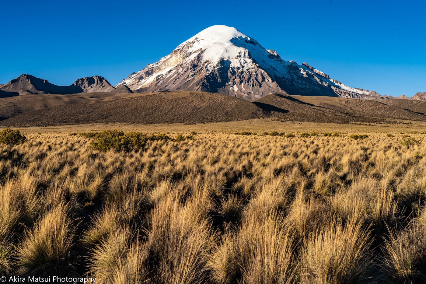 ボリビア西部、チリとの国境にそびえるサハマ山(標高6,542m)は、アンデス高原(アルティプラーノ)にそびえる単独峰です。