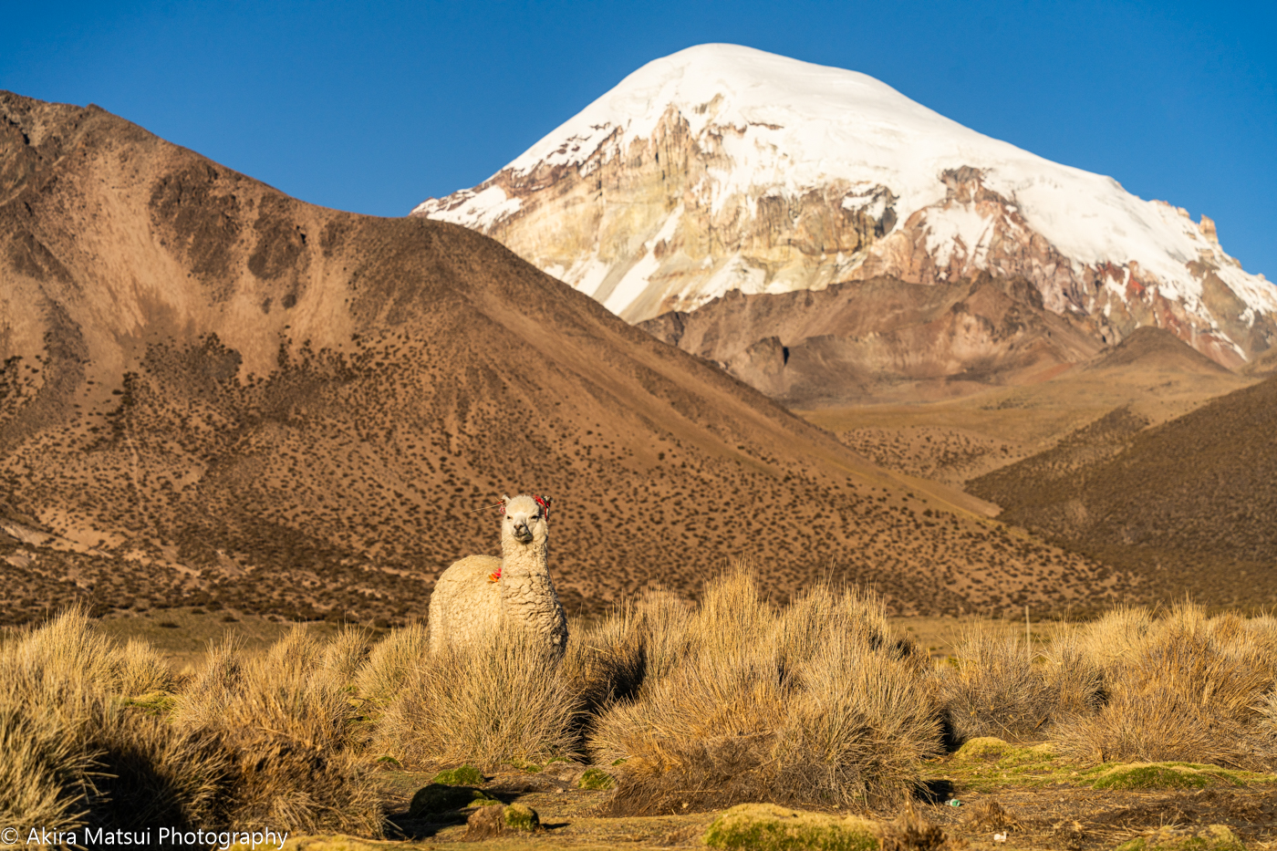厳しい寒さと乾燥の中にあっても、氷河の恵みによって草は育ちます。その草を食むアルパカにとって、サハマ山麓は理想的な放牧地でした。山岳民族・アイマラ族もまた、遠い昔、数千年前にアルパカとともに、この地に根を下ろしました。