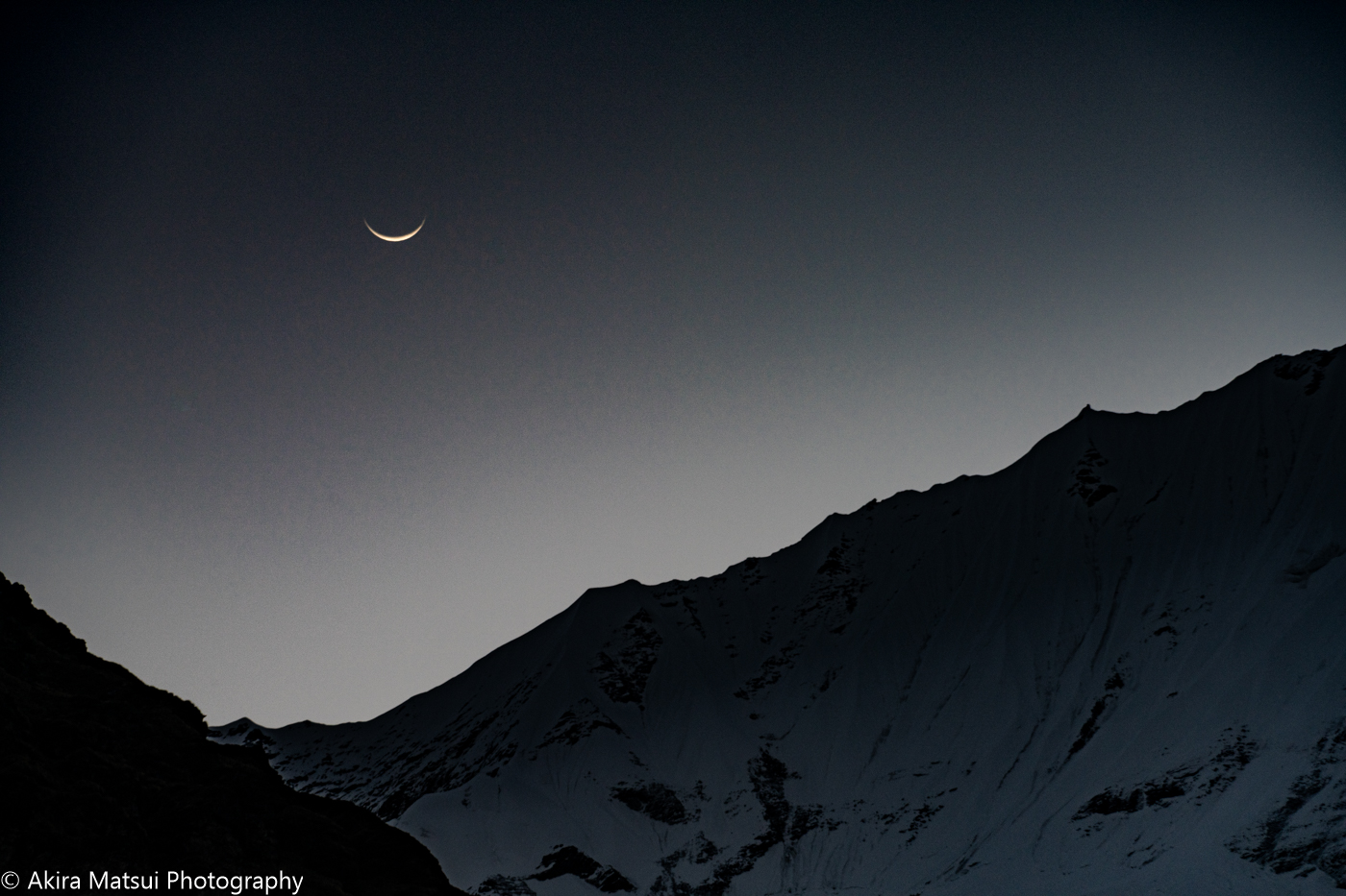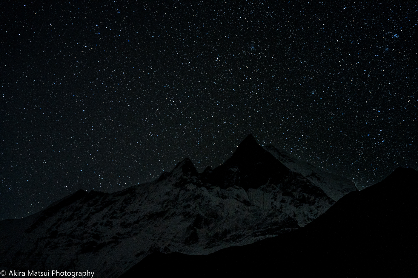 夕日の時間、ふと空を見上げると、一瞬だけ夕日に染まるマチャプチャレが姿を見せてくれました。