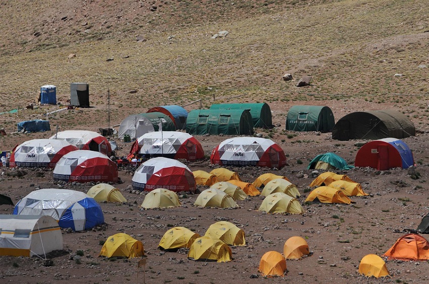 アコンカグアを展望するには、テント泊のトレッキングが必要となる。登山口オルコネス(2980m)から出発して徒歩約4時間で、ベースキャンプであるコンフルエンシア(3350m)に到着する。このベースキャンプはアコンカグア登頂でも基点となるので、シーズン中の12月~2月は、ちょっとしたテント村になる。展望トレッキングでも、このベースキャンプが基点なのだ。