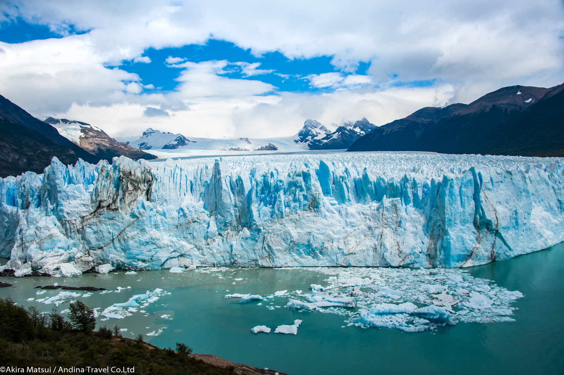 このアンデスの山上に広がる氷原から流れ落ちる氷の帯が「氷河」です。パタゴニアでアンデス山脈から流れ落ちる氷河の数は100以上に及び、その中で最も規模の大きな氷河がペリトモレノ氷河です。