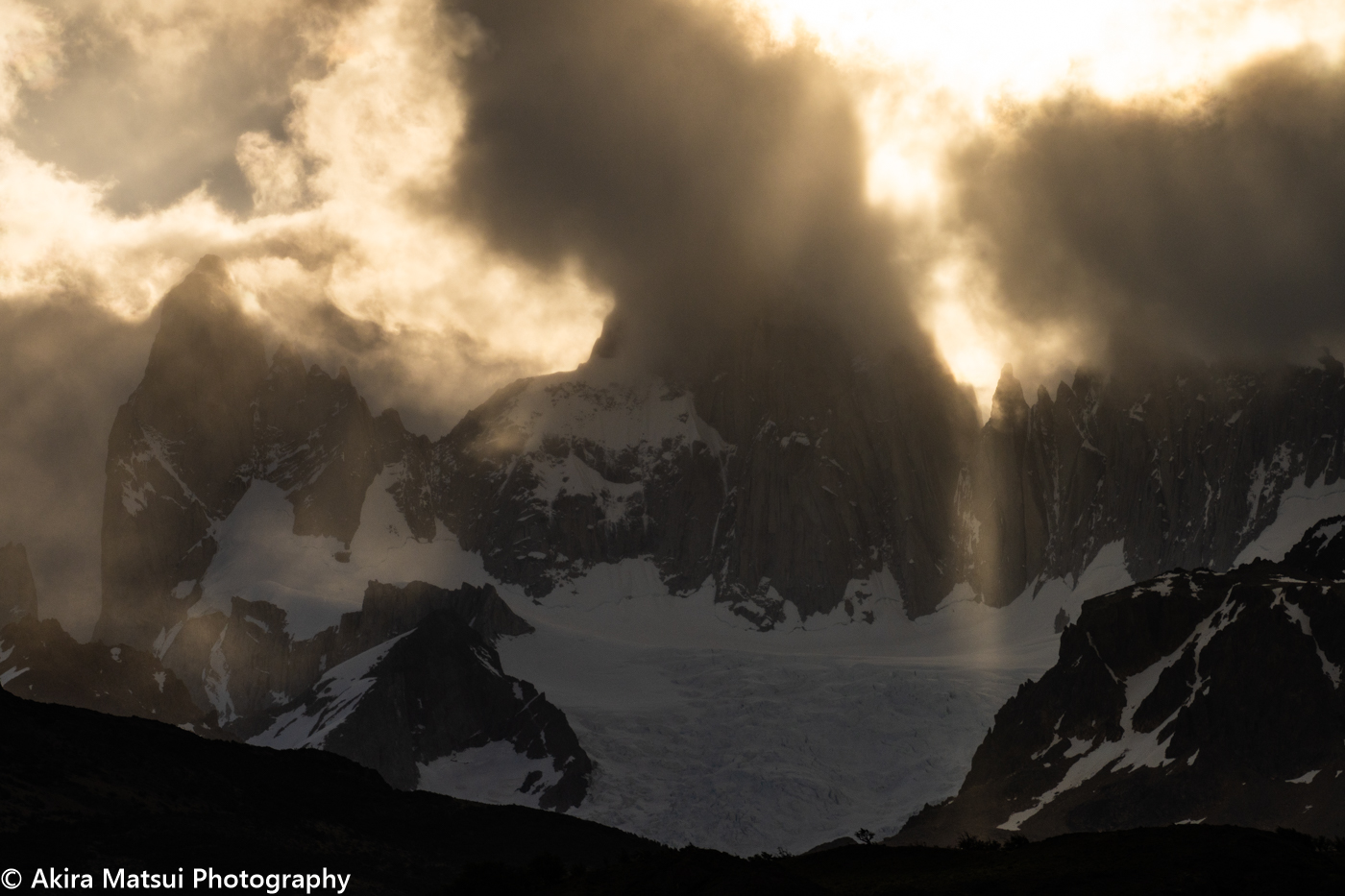 窓からは、草原の向こうで、フィッツロイ峰が雲間から夕日の光線で浮かんでいました。