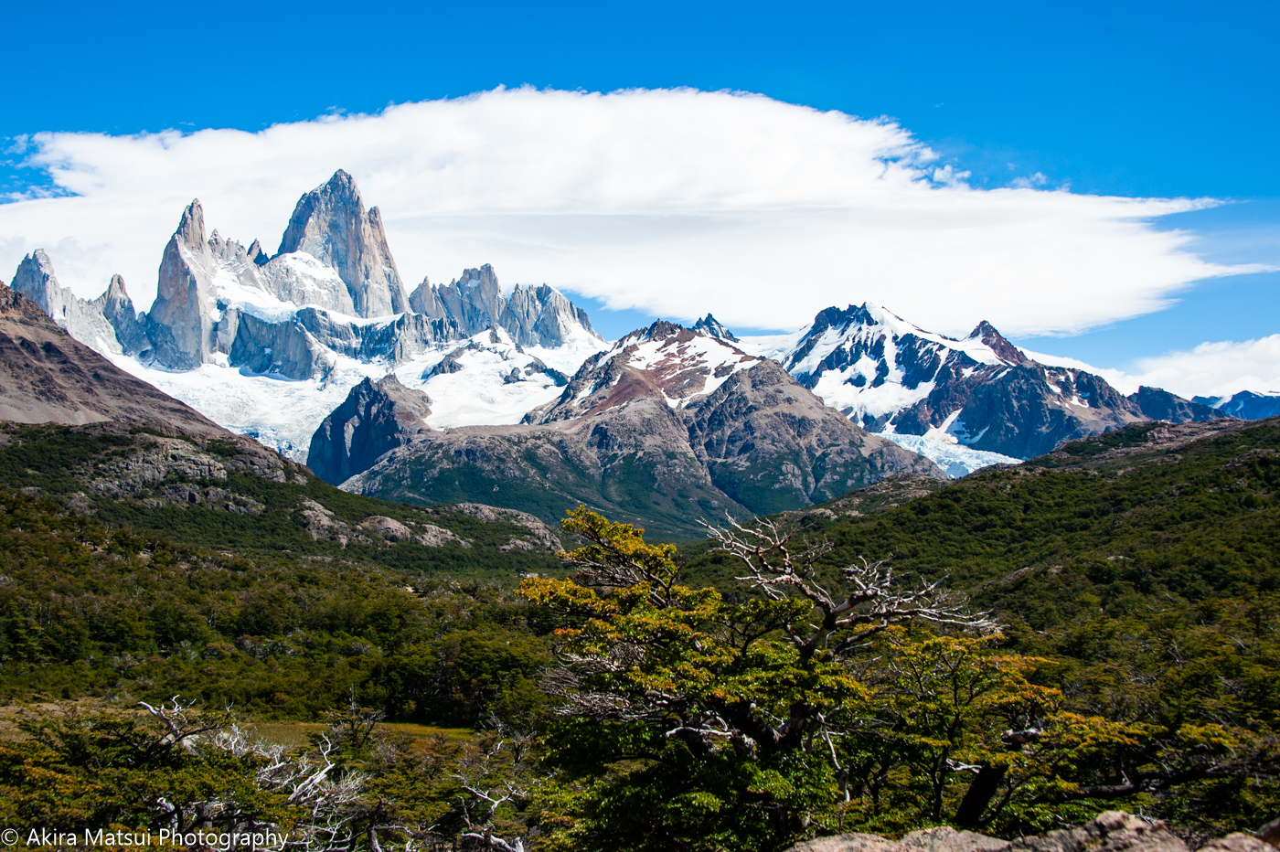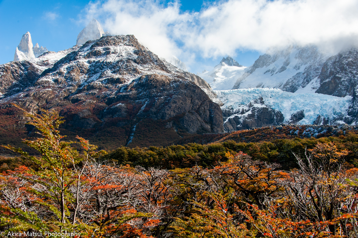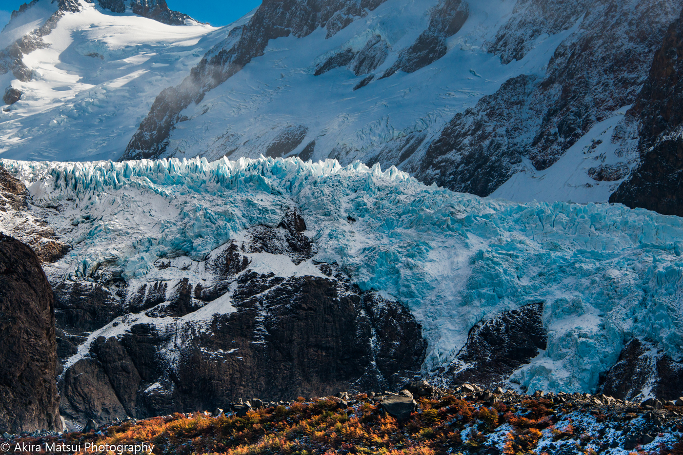 実際には、フィッツロイ峰が刻み込んだ深い谷の中を、この氷河が流れ出していて、その姿は、ピエドラ・ブランカ谷の正面からだけ、見ることができます。