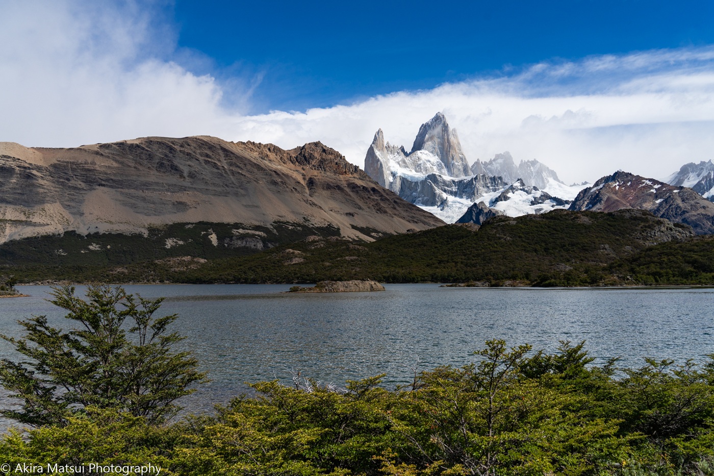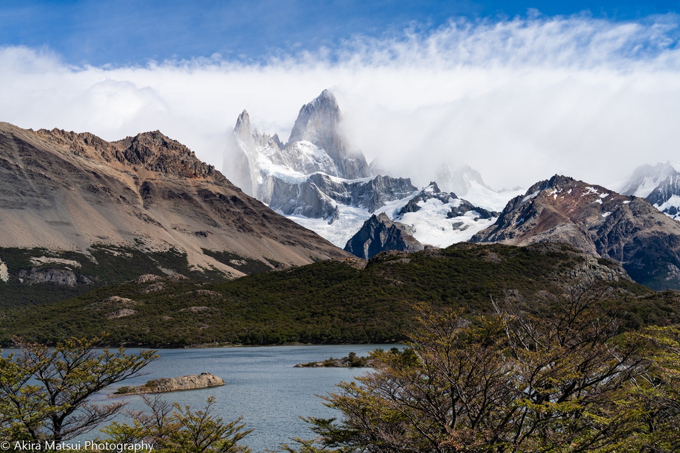 カプリ湖から望むパタゴニアの名峰フィッツロイ(3405m)